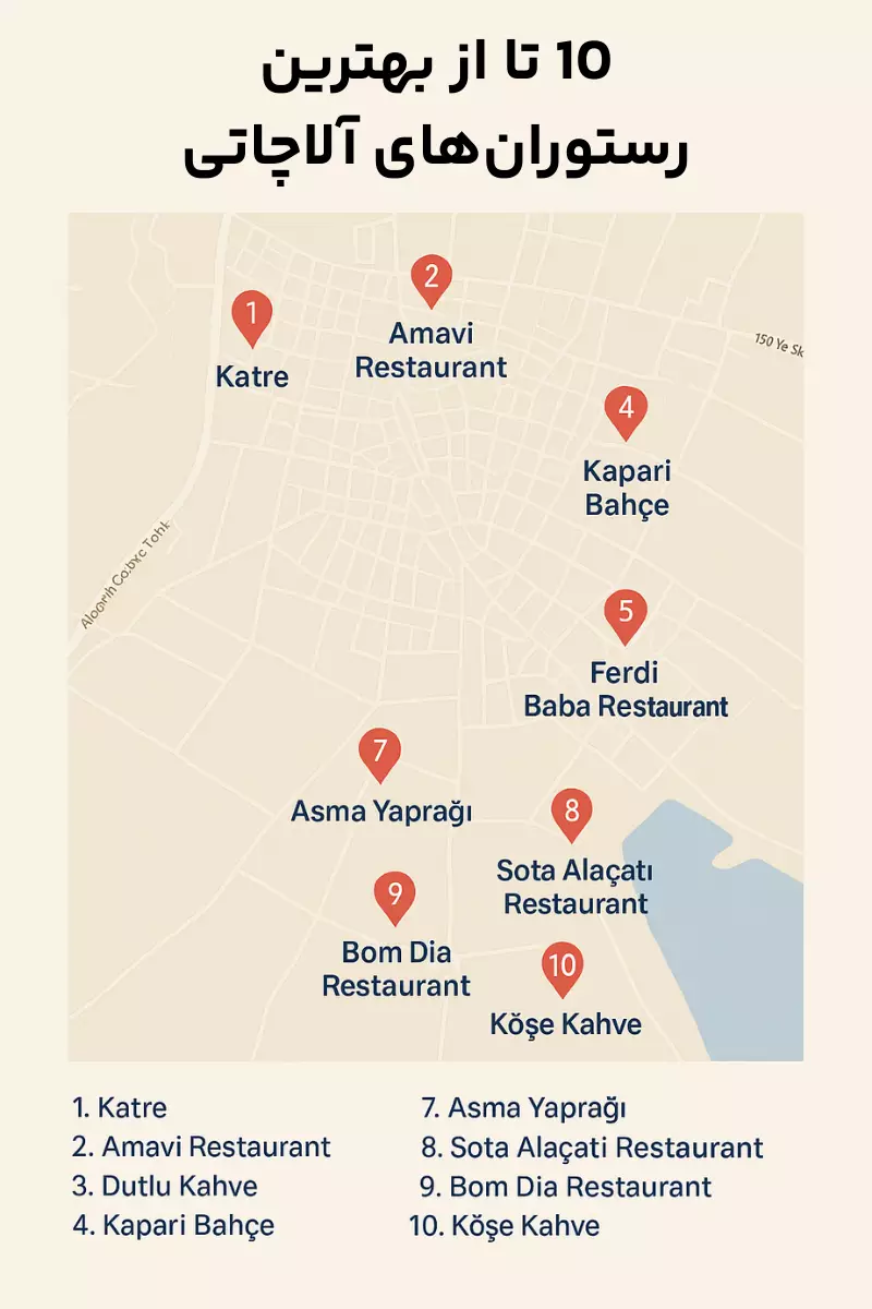 آلاچاتی یکی از شهرهای زیبای ساحلی ترکیه است که به خاطر غذاهای خوشمزهاش شناخته میشود اگر به آلاچاتی رفتید، حتماً غذاهای محلی و تازه رو تجربه کنید. این شهر برای غذاهای خوشمزهاش بسیار معروفه!